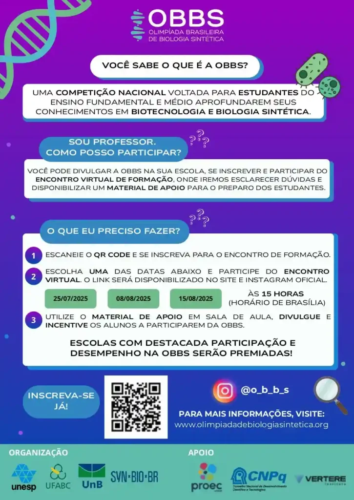 A 5ª edição da Olimpíada Brasileira de Biologia Sintética (OBBS) está com inscrições abertas até o dia 31 de agosto de 2025 e promete movimentar estudantes do Ensino Fundamental e Médio de escolas públicas e privadas de todo o Brasil. Organizada pela UNESP, UFABC, UnB e pelo grupo Synbio BR, com apoio do Instituto Vertere e recursos do CNPq e da UNESP (PROEC), a competição tem como objetivo despertar o interesse dos jovens pela ciência, aprofundar os conhecimentos em biotecnologia e biologia sintética e incentivar a pesquisa acadêmica.